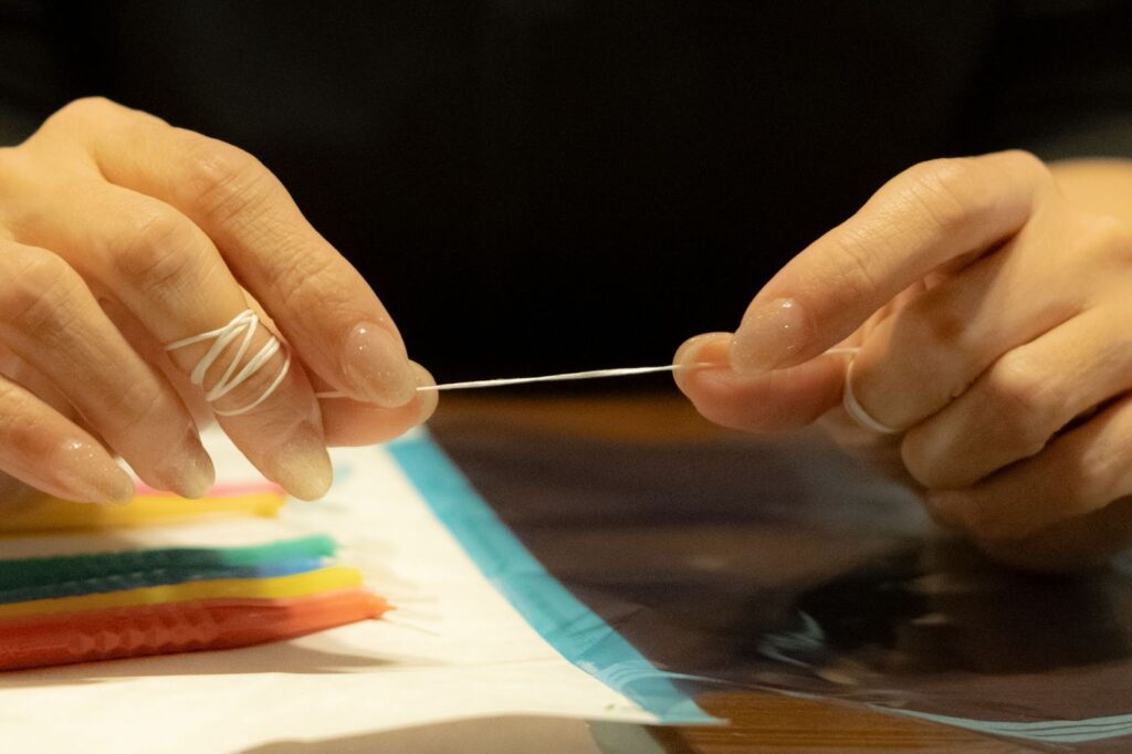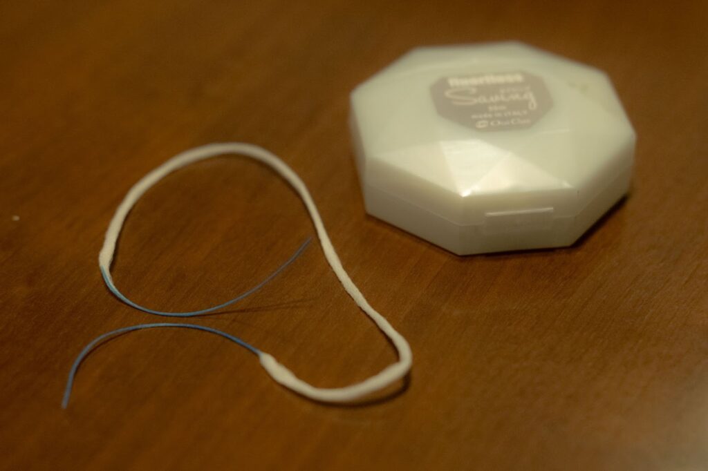 フロアフロスの糸に硬いスレッド(糸通し)部分が一体化している。
